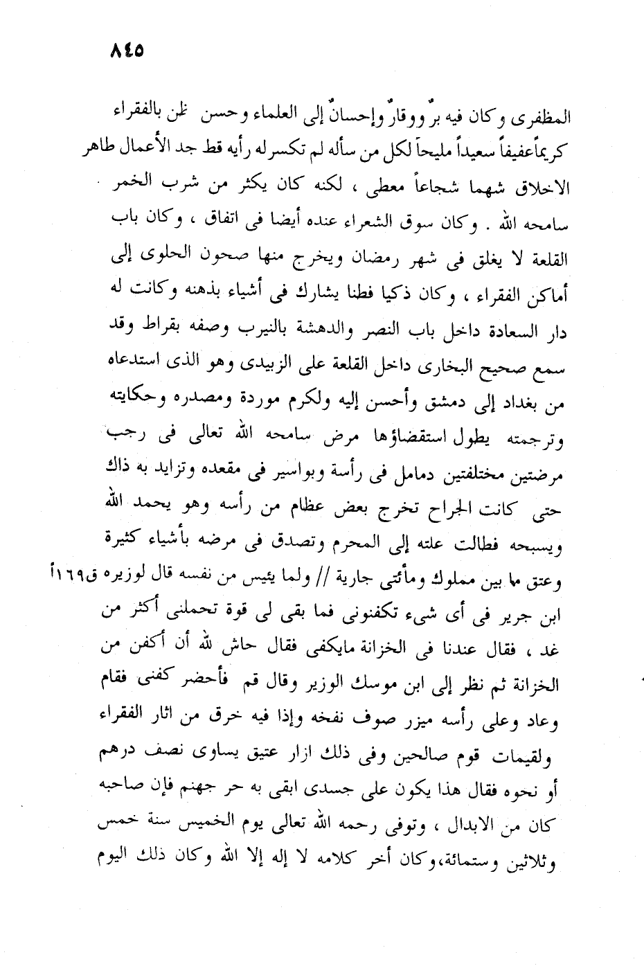 فطنا يشارك في أشياء بذهنه وكانت له دار السعادة داخل باب النصر والدهشة بالنيرب، وصفه بقراط، وقد سمع صحيح البخاري عنده داخل القلعة على الزبيدي، وهو الذي استدعاه من بغداد إلى دمشق وأحسن إليه وأكرم مورده ومصدره، وحكايته وترجمته يطول استقصاؤها، مرض سامحه الله تعالى في رجب مرضين مختلفين دمامل في رأسه، وبواسير في مقعده وتزايد به ذاك حتى كانت الجراح تخرج بعض عظام في رأسه، وهو يحمد الله ويسبحه، فطالت علته إلى المحرم، وتصدق في مرضه بأشياء كثيرة وأعتق مائتي مملوك ومائتي جارية، ولما يئس من نفسه قال لوزيره ابن جرير: في أي شيء تكفنوني، فما بقي لي قوة تحملني