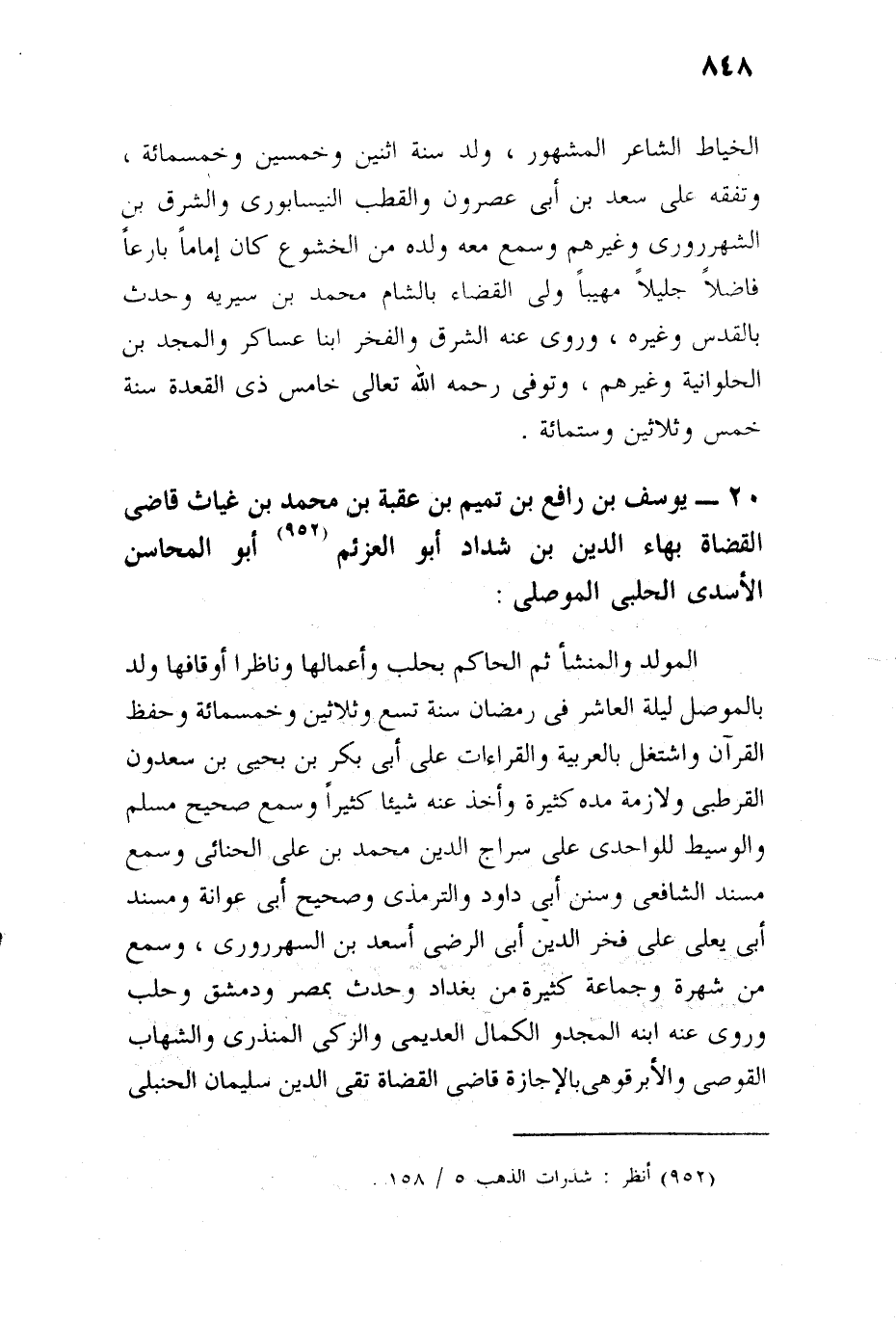 الموصلي المولد والمنشأ، ثم الحاكم بحلب وأعمالها وناظر أوقافها، ولد في ليلة العاشر في رمضان سنة تسع وثلاثين وخمس مائة، وحفظ القرآن، واشتغل بالعربية والقراءات على أبي بكر بن يحيى بن سعدون القرطبي، ولازمه مدة كبيرة، وأخذ عنه شيئا كثيرا، وسمع صحيح مسلم والوسيط للواحدي على سراج الدين محمد بن علي الجبائي، وسمع مسند الشافعي وسنن أبي داود والترمذي وصحيح أبي عوانة ومسند أبي يعلى على فخر الدين أبي الرضي أسعد بن الشهرزوري، وسمع من شهدة وجماعة كثيرين ببغداد وغيرها من البلاد، وتفقه وتفنن، وأفاد وأعاد بالنظامية ببغداد، وحدث بمصر ودمشق وحلب، وروى عنه ابنه