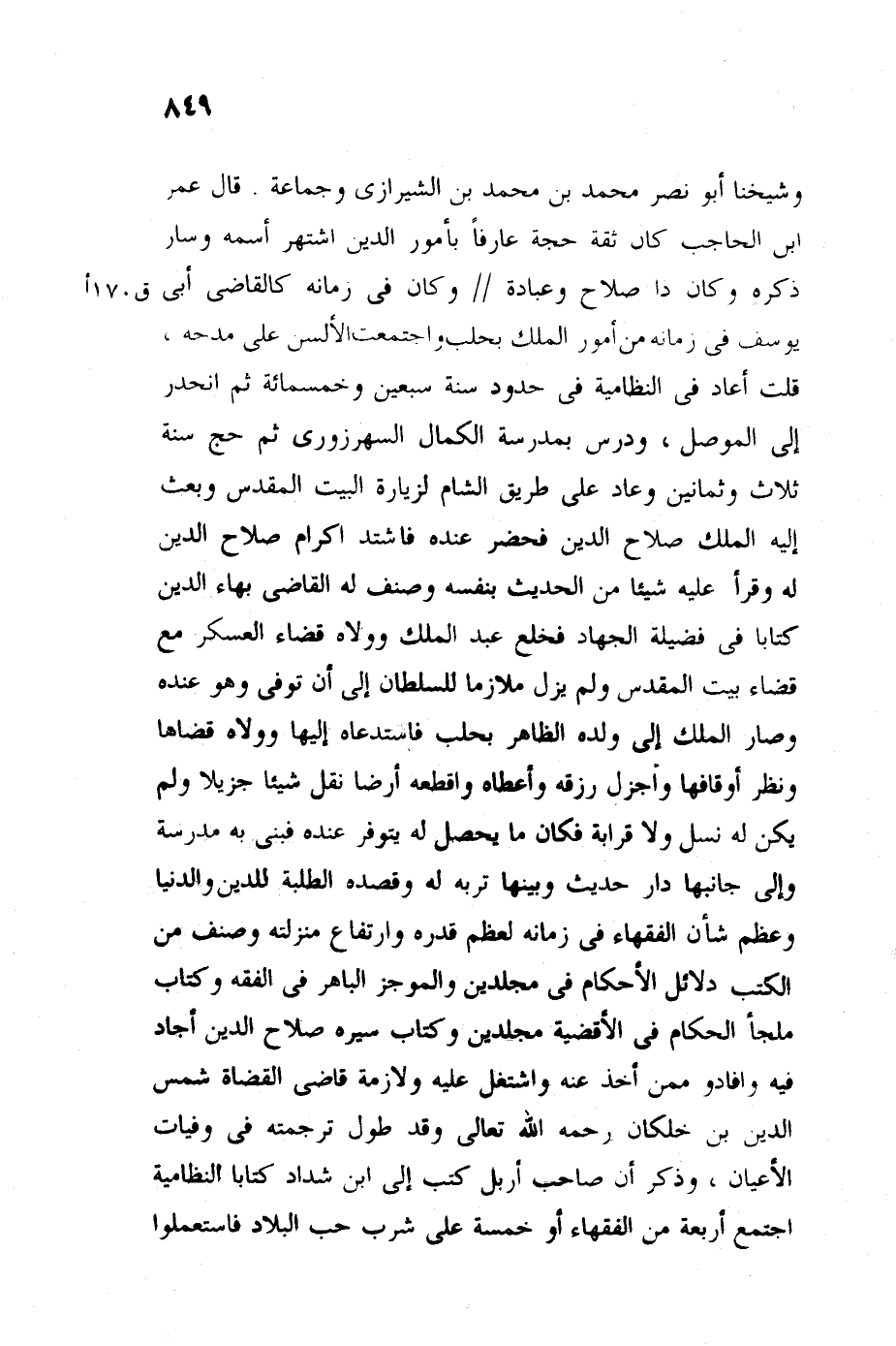قال عمر بن الحاجب: كان ثقة حجة عارفا بأمور الدين، اشتهر اسمه وسار ذكره، وكان ذا صلاح وعبادة، وكان في زمانه كالقاضي أبي يوسف في زمانه، دبر أمور الملك بحلب، واجتمعت الألسن على مدحه، قلت: أعاده في النظامية في حدود سنة سبعين وخمس مائة، ثم انحدر إلى الموصل، ودرس بمدرسة الكمال الشهرزوري ثم حج سنة ثلاث وثمانين وعاد على طريق الشام لزيارة بيت المقدس، وبعث إليه الملك صلاح الدين فحضر عنده فاشتد إكرام صلاح الدين له، وقرأ عليه شيئًا من الحديث بنفسه، وصنف له القاضي بهاء الدين كتابا في فضيلة الجهاد، فحظي عند الملك، وولاه قضاء العسكر مع قضاء بيت المقدس، ولم