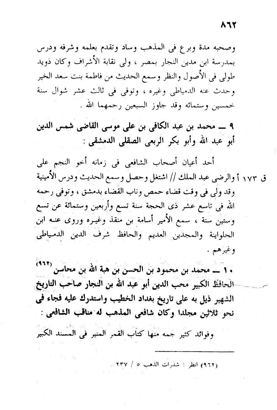 صاحب التاريخ الشهير الذي ذيل به على تاريخ بغداد للخطيب، واستدرك عليه فجاء في نحو ثلاثين مجلدًا، وكان شافعي المذهب له مناقب الشافعي، وفوائد كثيرة جمة منها كتاب القمر المنير في المسند الكبير