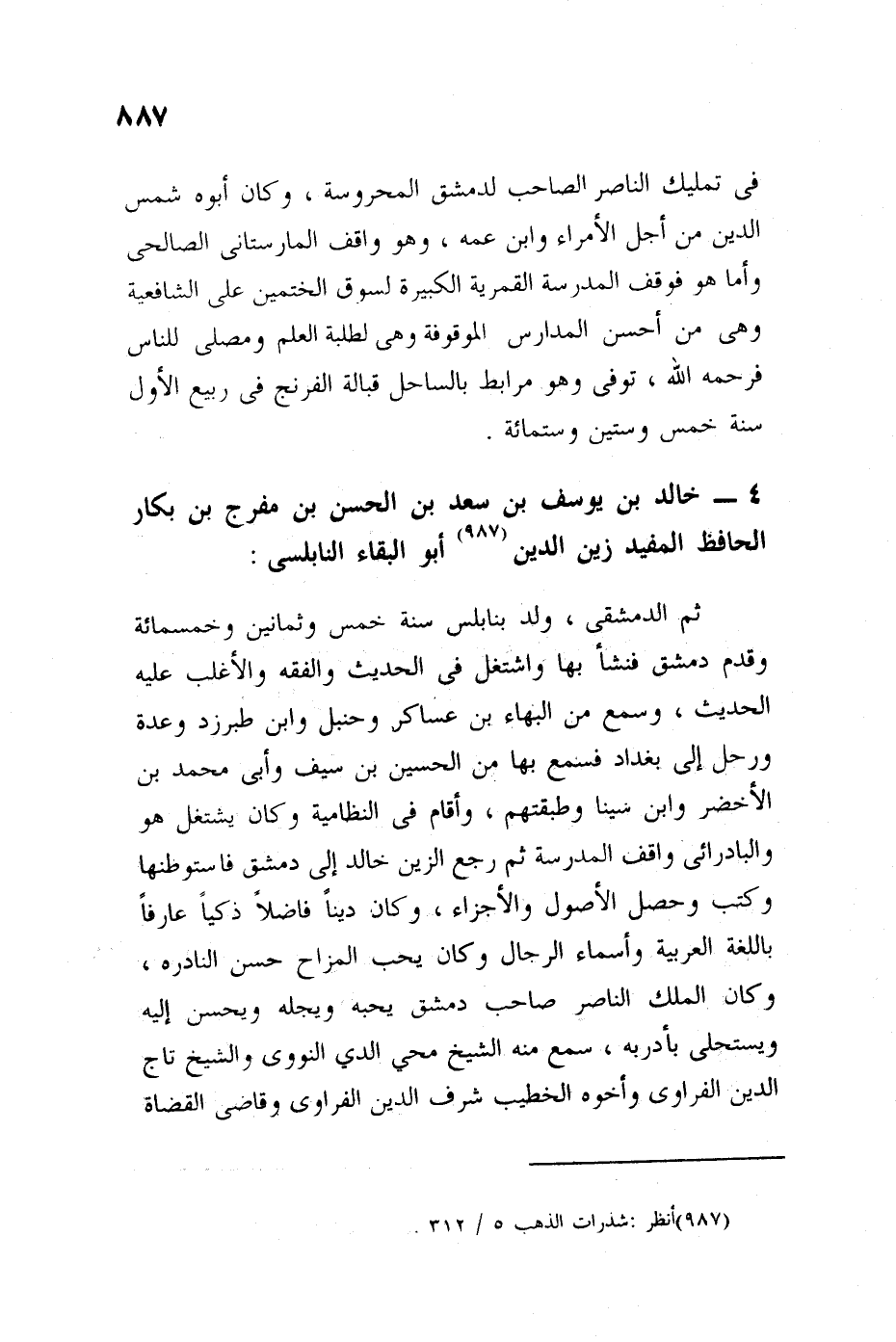 ثم الدمشقي، ولد بنابلس سنة خمس وثمانين وخمس مائة، وقدم دمشق فنشأ بها واشتغل في الحديث والفقه والأغلب عليه الحديث، وسمع من البهاء ابن عساكر، وحنبل، وابن طبرزد وعدة، ورحل إلى بغداد، فسمع بها من الحسين بن يوسف، وأبي محمد بن الأخضر، وابن مينا وطبقتهم، وأقام في النظامية، وكان يشتغل هو والبادرائي واقف المدرسة، ثم رجع الزين خالد إلى دمشق فاستوطنها، وكتب وحصل الأجزاء، وكان دينًا فاضلًا ذكيًا عارفًا باللغة العربية وأسماء الرجال، وكان يحب المزاح حسن النادرة، وكان الملك الناصر صاحب دمشق يحبه ويجله ويحسن إليه ويستحلي نادرته، سمع منه الشيخ محيي الدين