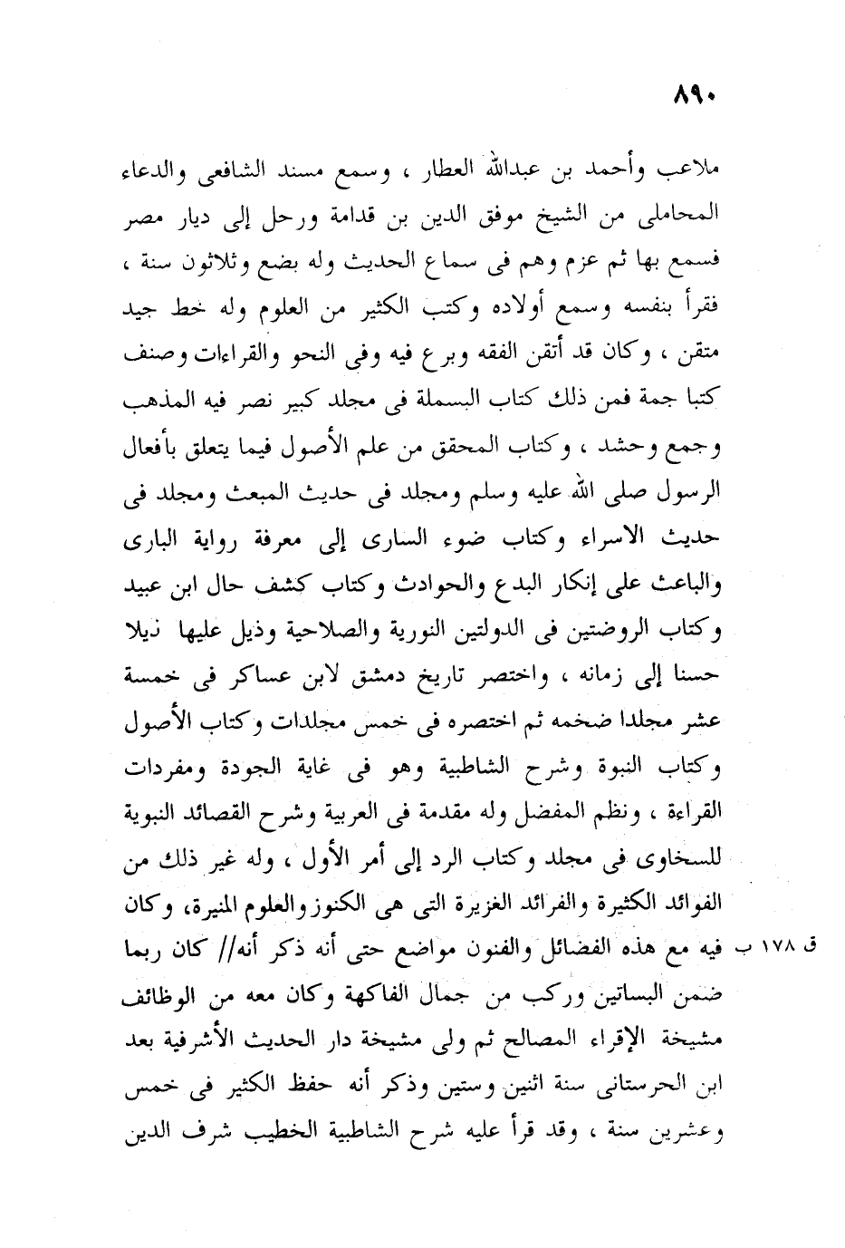 ملاعب، وأحمد بن عبد الله العطار، وسمع مسند الشافعي، والدعاء للمحاملي من الشيخ موفق الدين ابن قدامة، ورحل إلى ديار مصر فسمع بها، ثم عزم وهم في سماع الحديث، وله بضع وثلاثون سنة، فقرأ بنفسه وسمع أولاده وكتب الكثير من العلوم، وله خط جيد متقن، وكان قد أتقن الفقه، وبرع فيه وفي النحو والقراءات، وصنف كتبًا جمة فمن ذلك كتاب البسملة في مجلد كبير