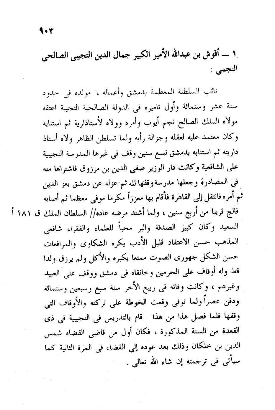 نائب السلطنة المعظمة بدمشق وأعمالها، مولده في حدود سنة عشر وست مائة، وأول تأميره في الدولة الصلاحية النجمية، أعتقه مولاه الملك الصالح نجم الدين أيوب، وأمره، وولاه الاستاذارية، وكان يعتمد عليه لعقله وجزالة رأيه، ولما تسلطن الظاهر ولاه أولا استاذارتيه، ثم استنابه بدمشق تسع وستين ووقف في عيونها المدرسة النجيبية على الشافعية، وكانت دار الوزير صفي الدين ابن مرزوق، فاشتراها منه في المصادرة، وجعلها مدرسة أثابه الله، ثم عزله عن دمشق بعز الدين إيدمر، فانتقل إلى القاهرة المحروسة، وأقام بها معززًا مكرمًا موقرا معظمًا، ثم أصابه الفالج قريبًا من أربع سنين،