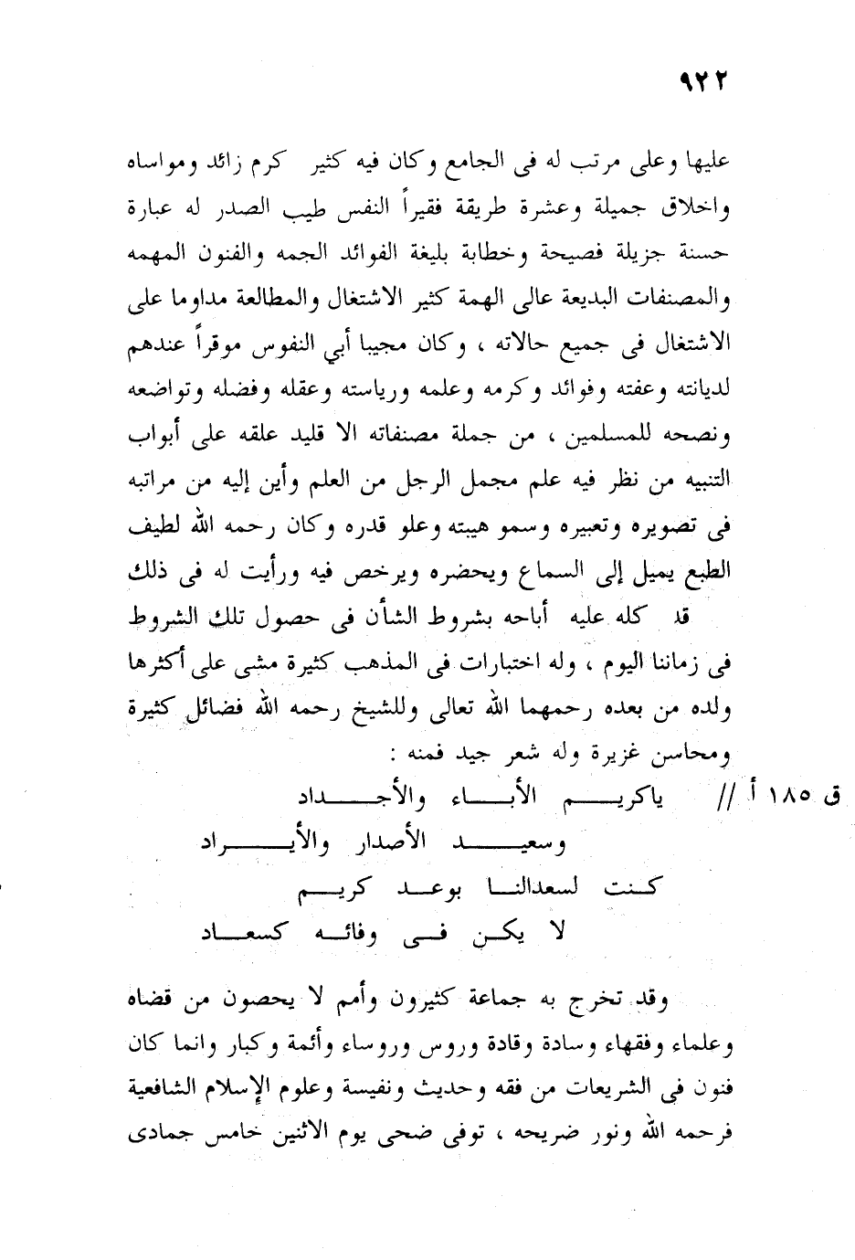 ويرخص فيه، ورأيت في ذلك شيئًا قد تكلم عليه أباحه بشروط الشأن في حصول تلك الشروط في زماننا اليوم، وله اختيارات في المذهب كثيرة، مشى على أكثرها ولده من بعده، رحمهما الله، وللشيخ رحمه الله فضائل كثيرة ومحاسن غزيرة، وله شعر جيد فمنه: