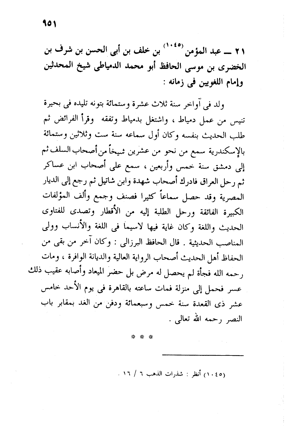 عبد المؤمن بن خلف بن أبي الحسن بن شرف بن الخضر بن موسى الحافظ أبو محمد الدمياطي شيخ المحدثين وإمام اللغويين في زمانه