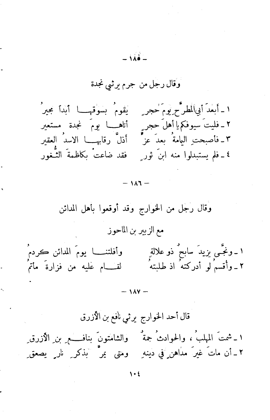 9 - فمت قطري إن في الموت راحة ... وأنت لديه لا محالة صائر الأبيات 1؟ 9 في فتوح ابن أعثم 2: 84 ب؛ 1؟ 3 في الأخبار الطوال: 286 والبيت 8 في ابن خلكان 4: 95، 7: 223.