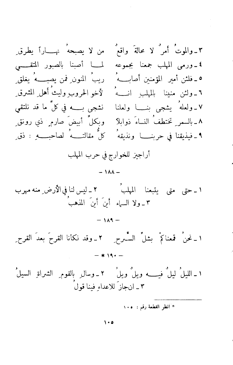 10 - ولم تك بي بعد البصيرة عرجة ... ولم يك لي بعد المهلب مذهب الأبيات 1؟ 10 في فتوح ابن أعثم 2: 84 ب؟ 85 / أ.