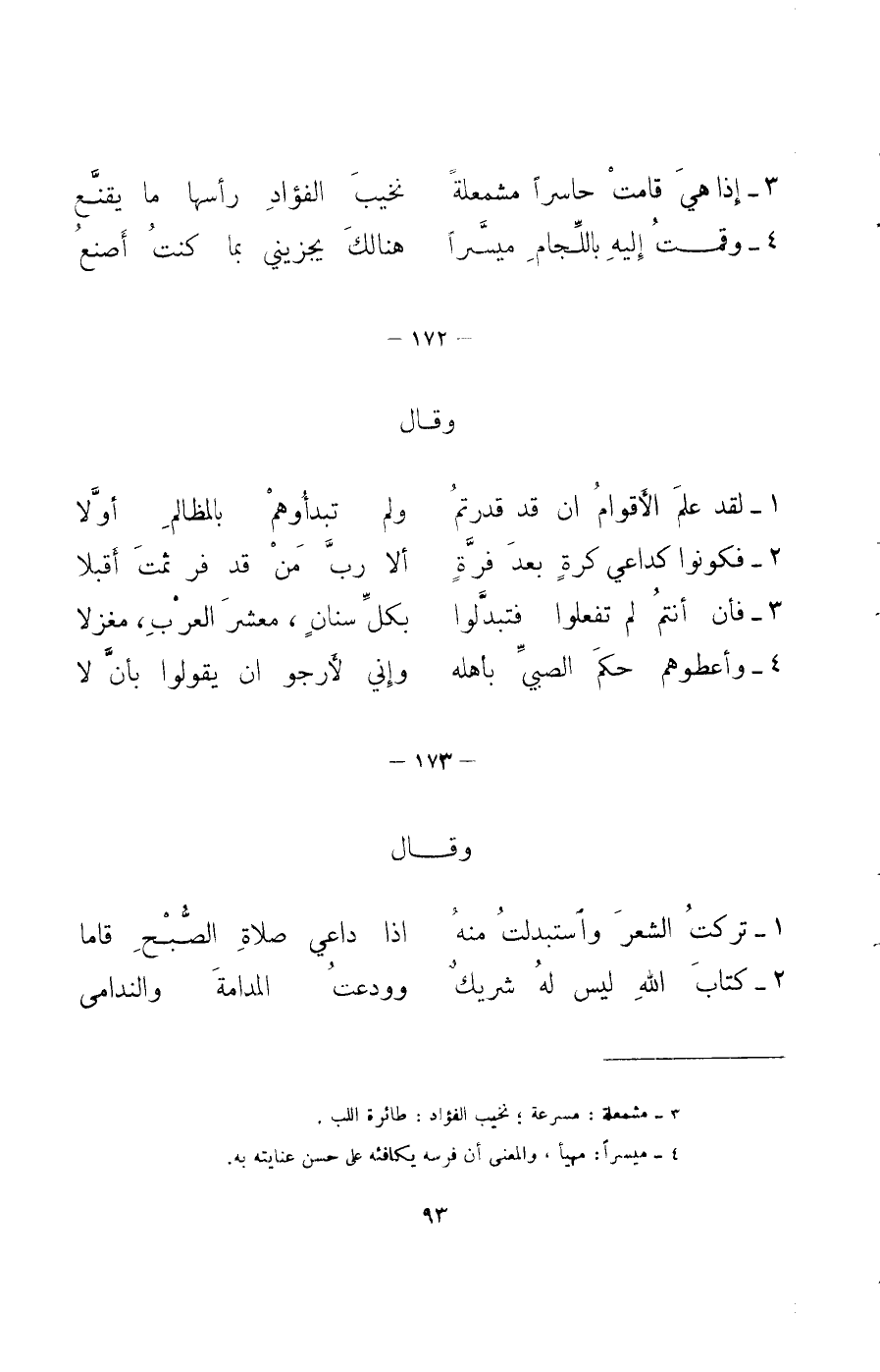 4 - أدباء إما جئتهم خطباء ... ضمناء كل كتيبة جرار الأبيات 1؟ 4 في البيان 1: 407 (لأبي العيزار) ؛ 1؟ 3 في شرح النهج 5: 51 وكنايات الجرحاني: 53 والبيتان 2، 3 في الحيوان 6: 424 وشرح النهج 1: 479 (4: 225) والكامل 3: 412 (تحقيق أبو الفضل إبراهيم) وبهجة المجالس 1: 476.