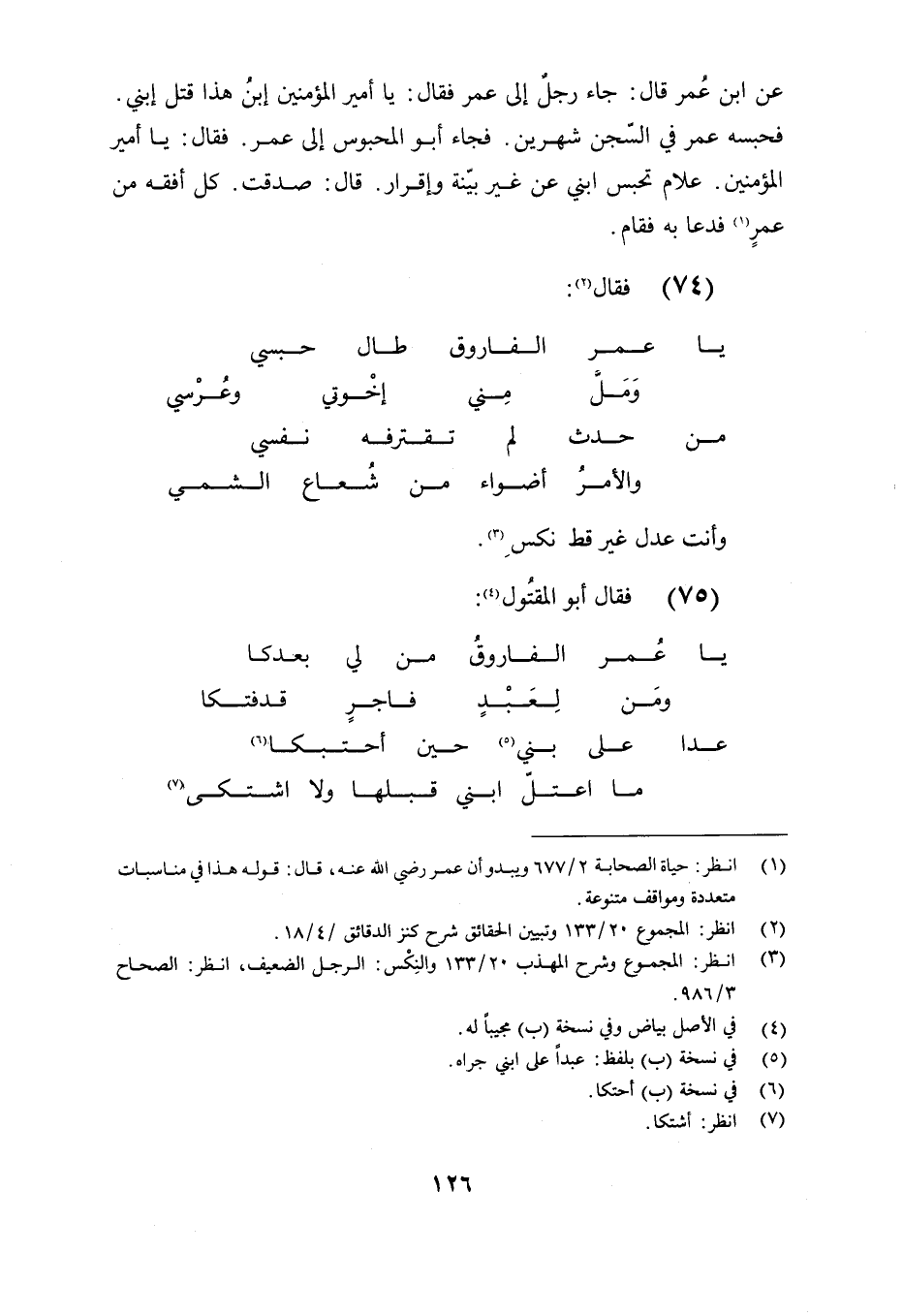 عن ابن عمر قال: جاء رجل إلى عمر فقال: يا أمير المؤمنين ابن هذا قتل ابني. فحبسه عمر في السجن شهرين. فجاء أبو المحبوس إلى عمر. فقال: يا أمير المؤمنين. علام تحبس ابني عن غير بينة وإقرار. قال: صدقت. كل أفقه من عمر فدعا به فقام.