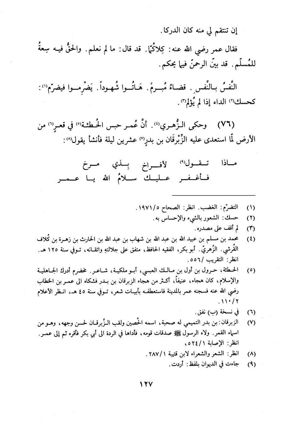 (76) وحكى الزهري. أن عمر حبس الحطئة في قعر من الأرض لما استعدي عليه الزبرقان بن بدر عشرين ليلة فأنشأ يقول: