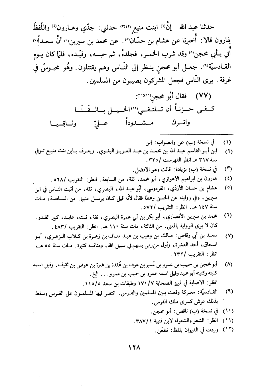 حدثنا عبد الله إن ابنت منيعٍ حدثني: جدي وهارون واللفظ لهارون قالا: أخبرنا عن هشام بن حسان. عن محمد بن سيرين أن سعدًا أتى بأبي محجن وقد شرب الخمر, فجلده, فجلده, ثم حبسه, وقيده, فلما كان يوم القادسية. جعل أبو محجن ينظر إلى الناس وهم يقتتلون. وهو محبوس في غرفة. يرى الناس فجعل المشركون يصيبون من المسلمين.