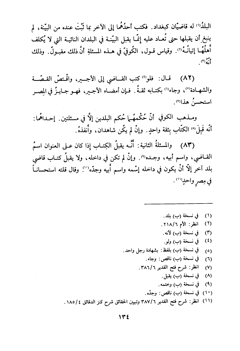 (83) والمسألة الثانية: أنه يقبل الكتاب إذا كان على العنوان اسم القاضي, واسم أبيه, وجده. وإن لم تكن في داخله, ولا يقبلُ كتاب قاضي بلد آخر إلا أن يكون في داخله اسمه واسم أبيه وجده. وقال قلته استحسانًا في مصر واحدٍ.