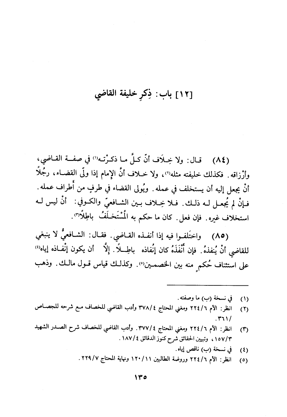 (84) قال: ولا خلاف أن كل ما ذكرته في صفة القاضي, وأرزاقه. فكذلك خليفته مثله, ولا خلاف أن الإمام إذا ولى القضاء رجلًا أن يجعل إليه أن يستخلف في عمله. ويولى القضاء في طرفٍ من أطراف عمله.
