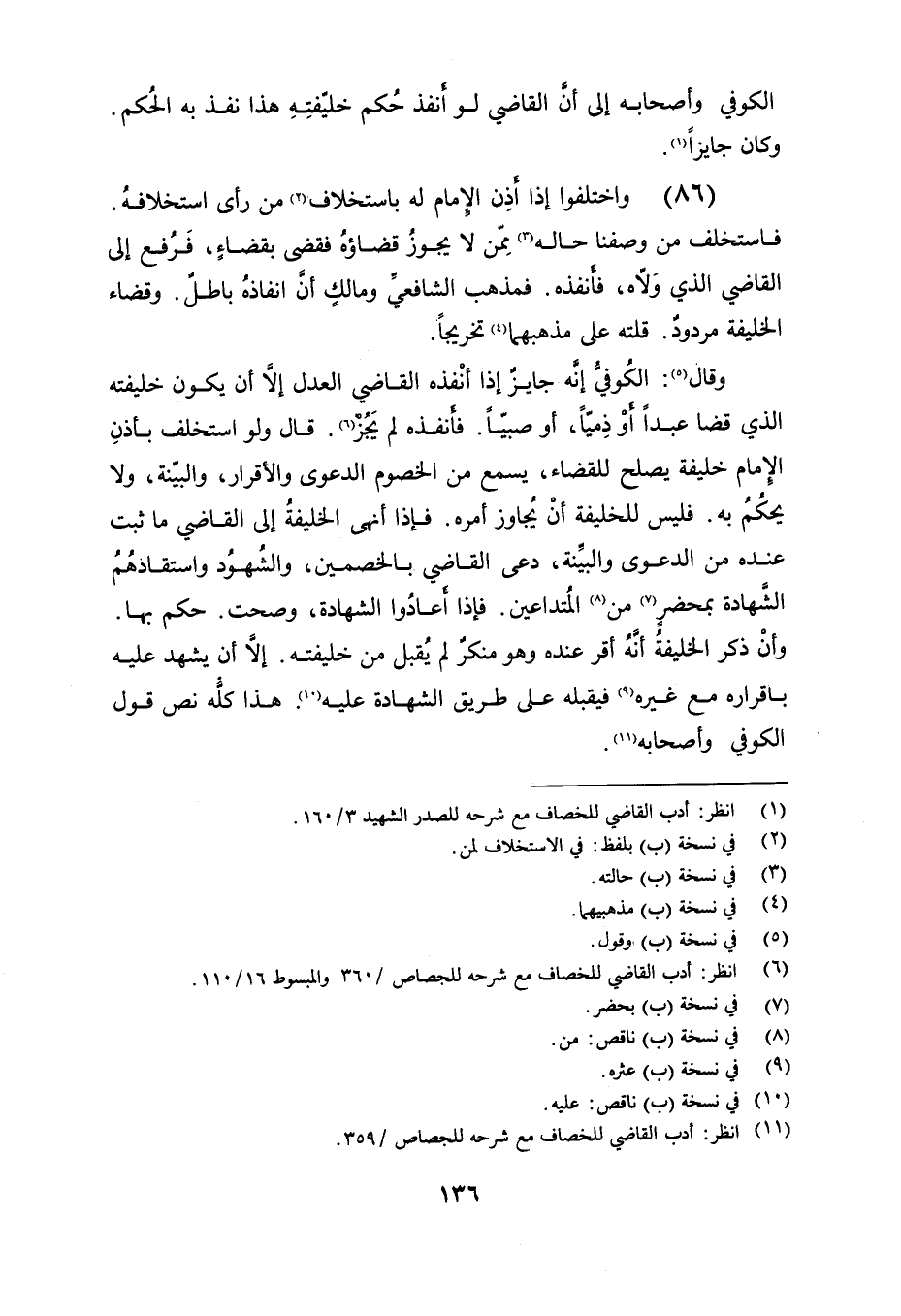 وقال الكوفي: إنه جايز إذا أنفذه القاضي العدل إلا أن يكون خليفته الذي قضا عبدًا أو ذميًا, أو صبيًا. فأنفذه لم يجز. قال: ولو استخلف بأذنِ الإمام خليفة يصلح للقضاء, يسمع من الخصوم الدعوي والإقرار, والبينة, ولا يحكم به. فليس للخليفة أن يجاوز أمره. فإذا أنهى الخليفة إلى القاضي ما ثبت عنده من الدعوى والبينة, دعى القاضي بالخصمين, والشهود واستقادهم الشهادة بمحضر من المتداعين. فإذا أعادوا الشهادة, وصحت, حكم بها. وأن ذكر الخليفة أنه أقر عنده وهو منكر لم يقبل من خليفته. إلا أن يشهد عليه بإقراره مع غيره فيقبله على طريق الشهادة عليه, هذا كله نص قول الكوفي وأصحابه.