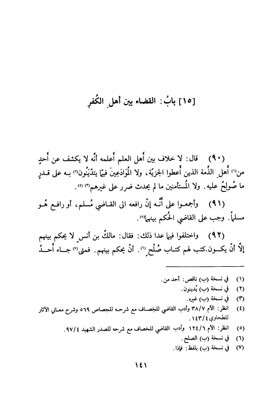 (92) واختلفوا فيما عدا ذلك فقال مالك بن أنس: لا يحكم بينهم إلا أن يكون كتب لهم كتاب صلح أن يحكم بينهم. فمتى جاء أحد