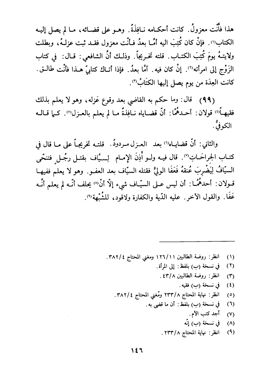 (99) قال: وما حكم به القاضي بعد وقوع عزله, وهو لا يعلم بذلك ففيها قولان: أحدهما: أن قضاياه نافذة ما لم يعلم بالعزل. كما قاله الكوفي.