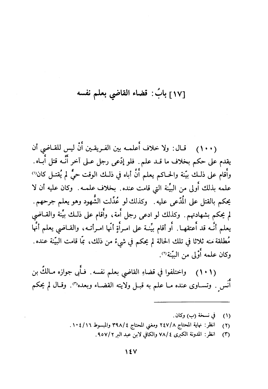(101) واختلفوا في قضاء القاضي بعلم نفسه. فأبى جوازه مالك بن أنس. وتساوي عنده ما علم به قبل ولايته القضاء وبعده. وقال لم يحكم