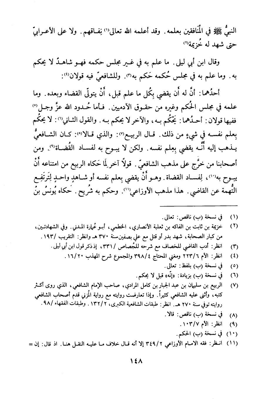 أحدهما: أن له أن يقضي بكل ما علم قبل, أن يتولى القضاء وبعده. وما علمه في مجلس الحكم وغيره من حقوق الآدميين. فأما حدود الله عز وجل ففيها قولان: أحدهما: يحكم به, والآخر لا يحكم به. والقول الثاني: لا يحكم بعلم نفسه في شيء من ذلك. قال الربيع: والذي قالا: كان الشافعي يذهب إليه أنه يقضى بعلم نفسه. ولكن لا يبوح به لفساد القضاة