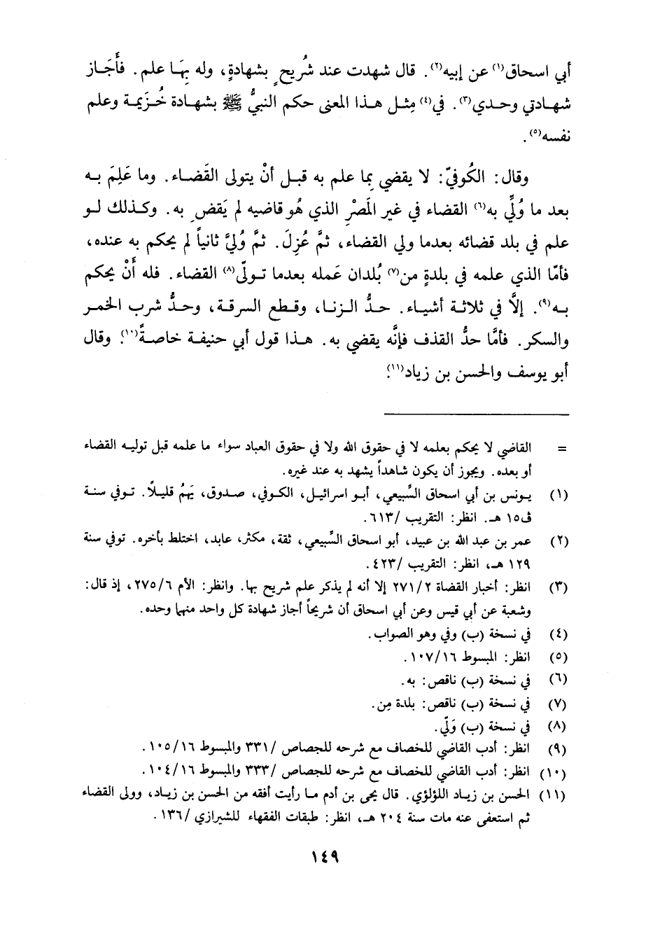 وقال الكوفي: لا يقضى بما علم به قبل أن يتولى القضاء. وما علم به بعد ما ولي به القضاء في غير المصر الذي هو قاضيه لم يقض به. وكذلك لو علم في بلد قضائه بعدما ولي القضاء, ثم عزل. ثم ولي ثانيًا لم يحكم به عنده, فأما الذي علمه في بلدة من بلدان عمله بعدما تولى القضاء. فله أن يحكم به إلا في ثلاثة أشياء. حد الزنا, وقطع السرقة, وحدٌ شرب الخمر والسكر. فأما حد القذف فإنه يقضي به. هذا قول أبي حنيفة خاصة. وقال أبو يوسف والحسن بن زياد.