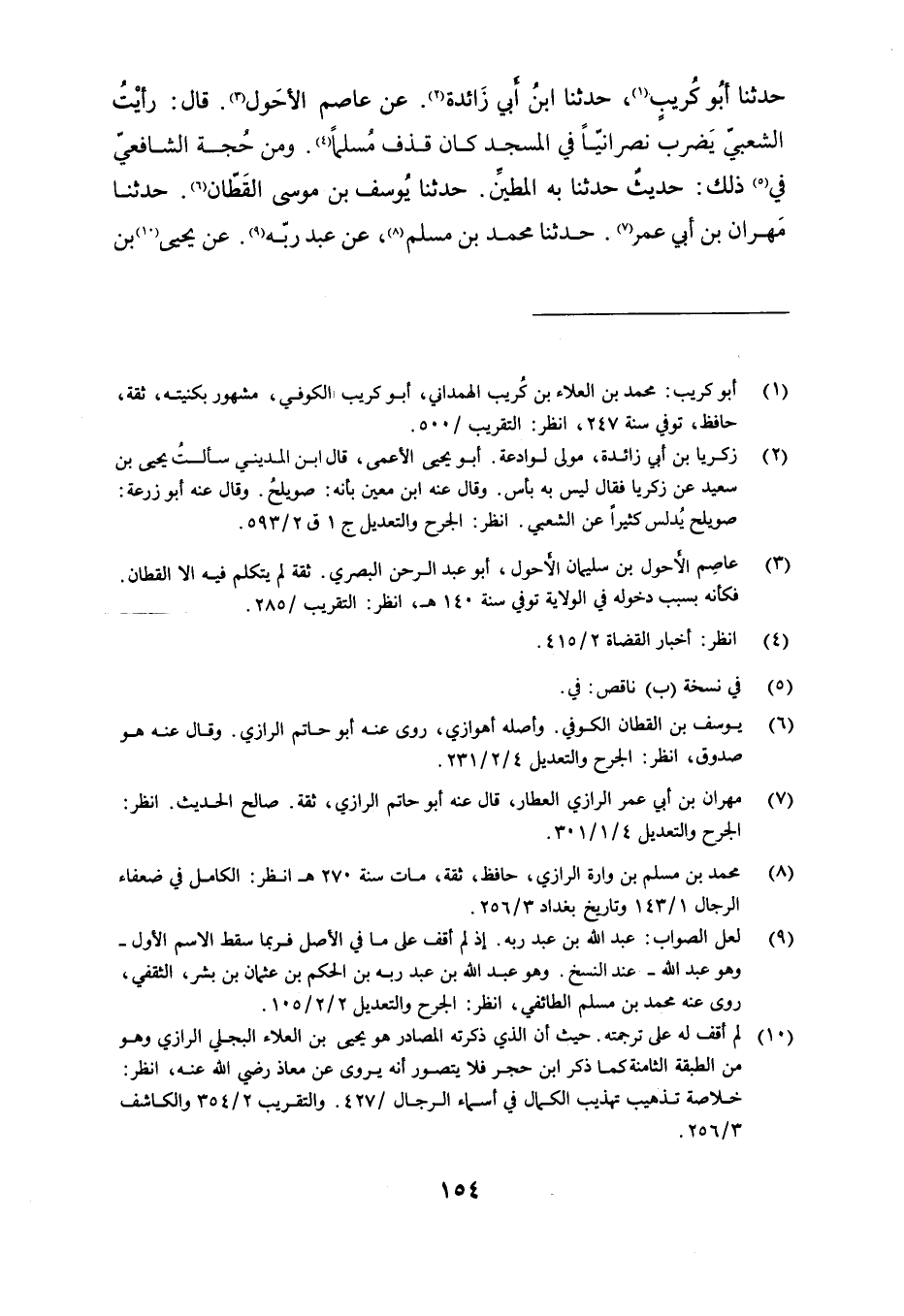 حدثنا أبو كريب, حدثنا ابن أبي زائدة. عن عاصم الأحول. قال: رأيت الشعبي يضرب نصرانيًا في المسجد كان قذف مسلمًا. ومن حجة الشافعي في ذلك: حديث حدثنا به المطين. حدثنا يوسف بن موسى القطان. حدثنا مهران بن أبي عمر. حدثنا محمد بن مسلم, عن عبد ربه. عن يحيى بن