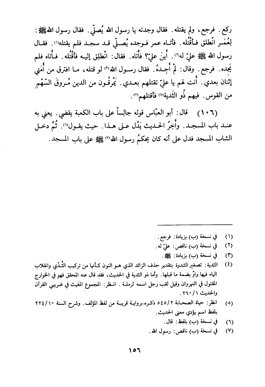 (106) قال: أبو العباس قوله جالسًا على باب الكعبة يقضي. يعني به عند باب المسجد. وأخر الحديث يدل على هذا. حيث يقول ثم دخل الشاب المسجد فدل على أنه كان يحكم رسول الله - صلى الله عليه وسلم - على باب المسجد.