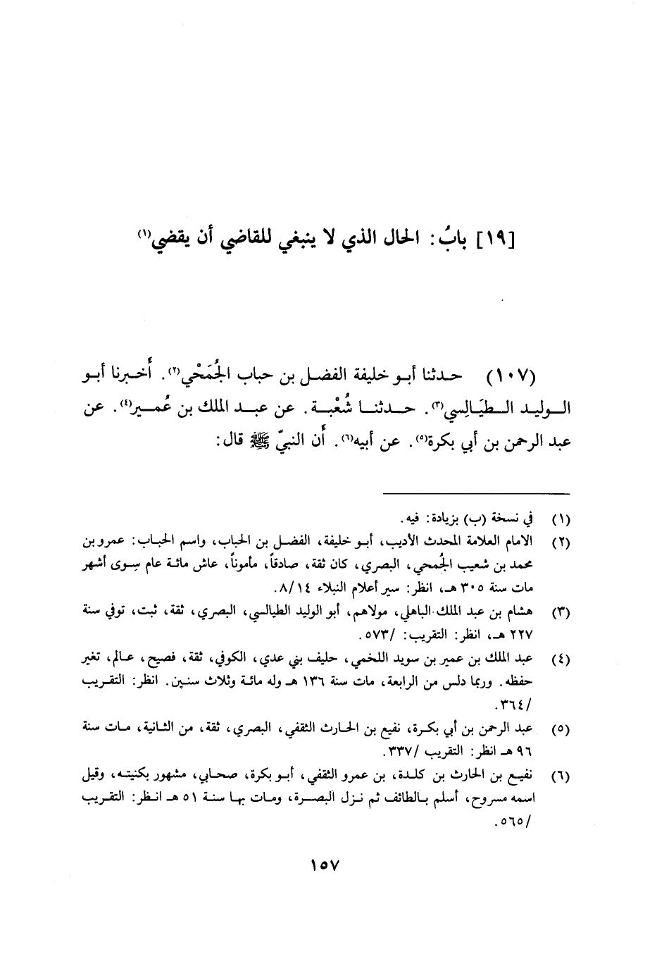 (107) حدثنا أبو خليفة الفضل بن حباب الجمحي. أخبرنا أبو الوليد الطيالسي. حدثنا شعبة. عن عبد الملك بن عمير. عن عبد الرحمن بن أبي بكرة. عن أبيه. أن النبي - صلى الله عليه وسلم - قال: