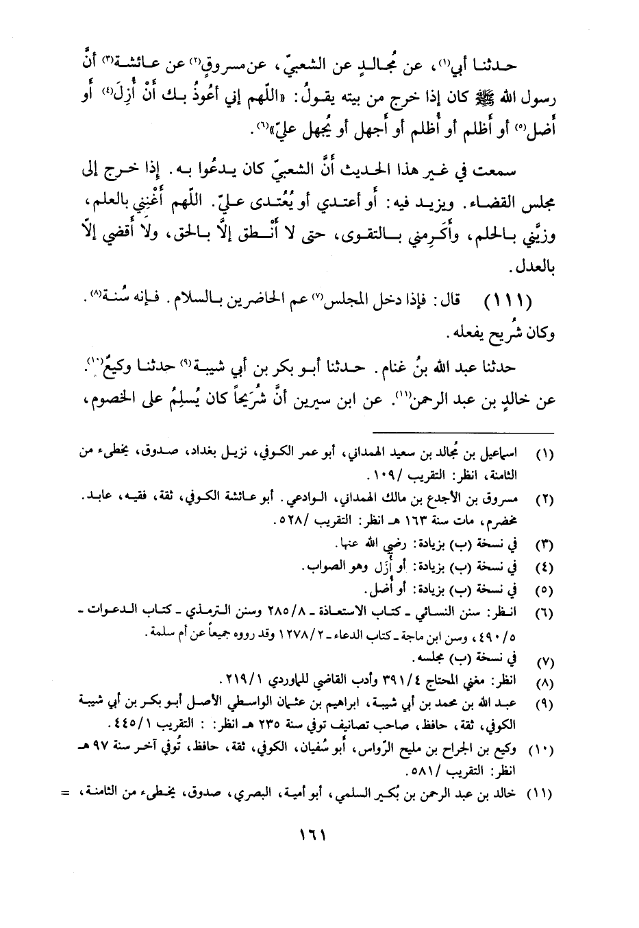 سمعت في غير هذا الحديث أن الشعبي كان يدعو به. إذا خرج إلى مجلس القضاء. ويزيد فيه: أو أعتدي أو يعتدى عليّ. اللهم أغنني بالعلم, وزيني بالحلم, وأكرمني بالتقوى, حتى لا أنطق إلا بالحق, ولا أقضي إلا بالعدل.