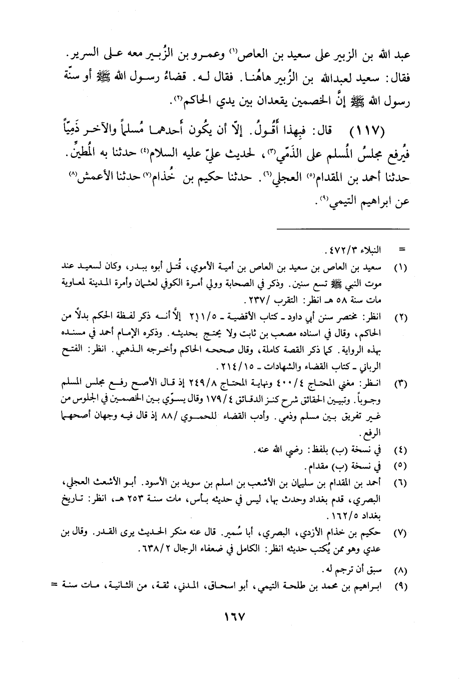 (117) قال: فبهذا أقول. إلا أن يكون أحدهما مسلما والآخر ذميًا فيرفع مجلس المسلم على الذمي, لحديث عليّ عليه السلام حدثنا بن المطين. حدثنا أحمد بن المقدام العجلي. حدثنا حكيم بن خذام, حدثنا الأعمش عن إبراهيم التيمي.
