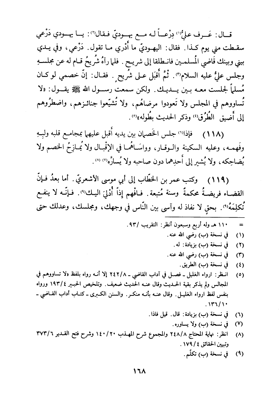 (119) وكتب عمر بن الخطاب إلى أبي موسى الأشعري. أما بعد فإن القضاء فريضة محكمة وسنة متبعة. فافهم إذا أدلي إليك. فإنه لا ينفع تكلمه. بحق لا نفاذ له وآسى بين الناس في وجهك, ومجلسك, وعدلك حتى