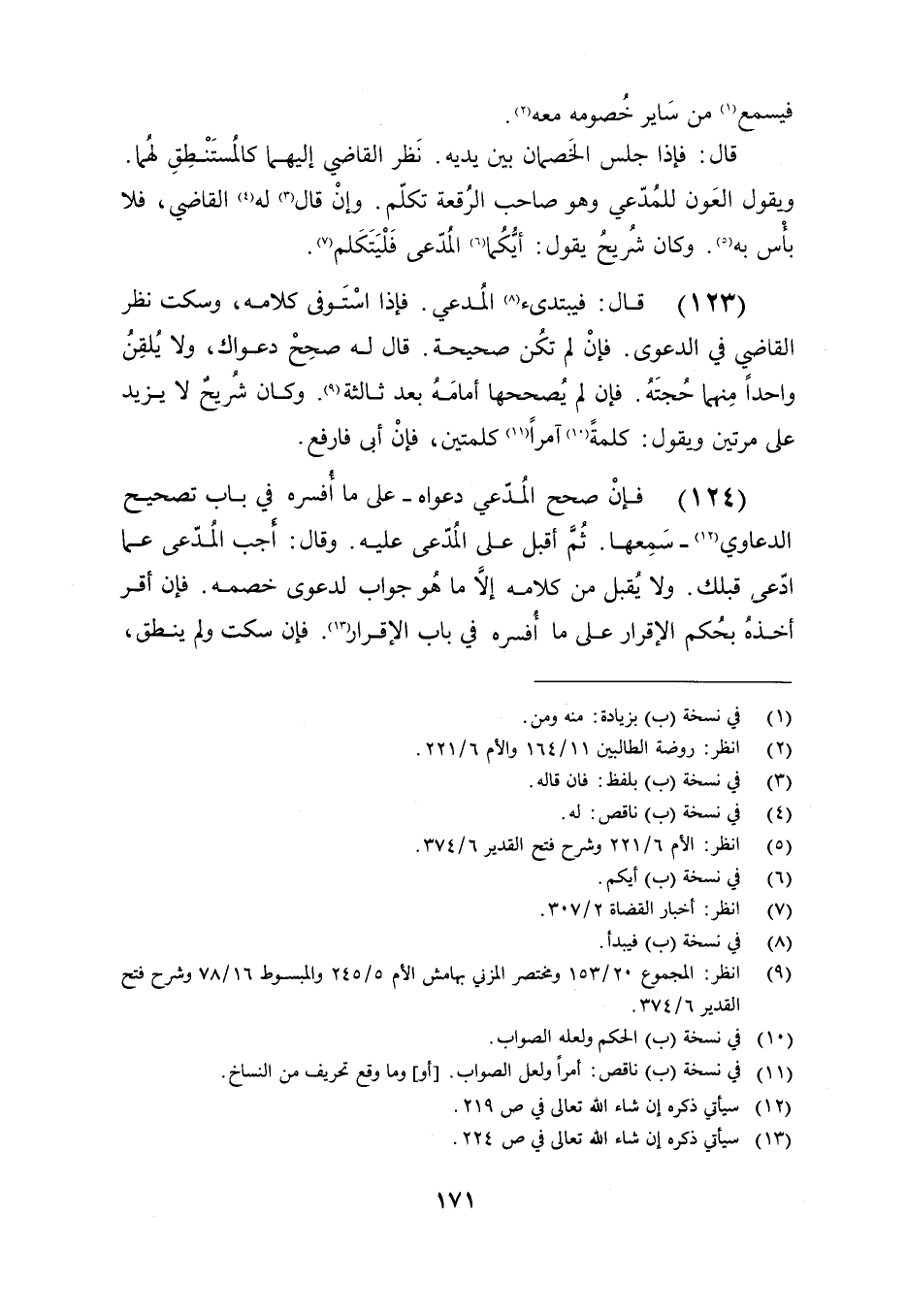(123) قال: فيبتدئ المدعي. فإذا استوفى كلامه, وسكت نظر القاضي في الدعوى. فإن لم تكم صحيحه. قال له صحيح دعواك, ولا يلقن واحدًا منهما حجته. فإن لم يصححها أمامه بعد ثالثة. وكان شريح لا يزيد على مرتين ويقول: كلمة آمرًا كلمتين, فإن أبى فارفع.