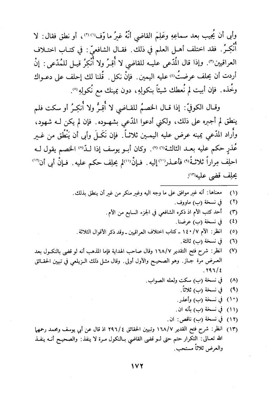 وقال الكوفي: إذا قال الخصم للقاضي لا أقر ولا أنكر أو سكت فلم ينطق لم أجبره على ذلك, ولكني أدعوا المدعي بشهوده. فإن لم يكن له شهود, وأراد المدعي يمينه عرض عليه اليمين ثلاثًا. فإن نكل وأبى أن ينطق من غير عذر حكم عليه بعد الثالثة. وكان أبو يوسف إذا لد الخصم يقول له احلف مرارًا ثلاثة فأعذر إليه. فإن لم يحلف حكم عليه. فإن أبى أن يحلف قضى عليه.