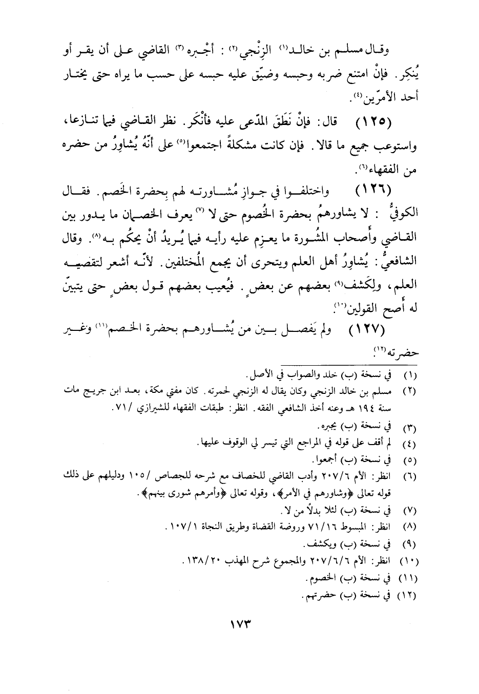 (127) ولم يفصل بين من يشاورهم بحضرة الخصم وغير حضرته.
