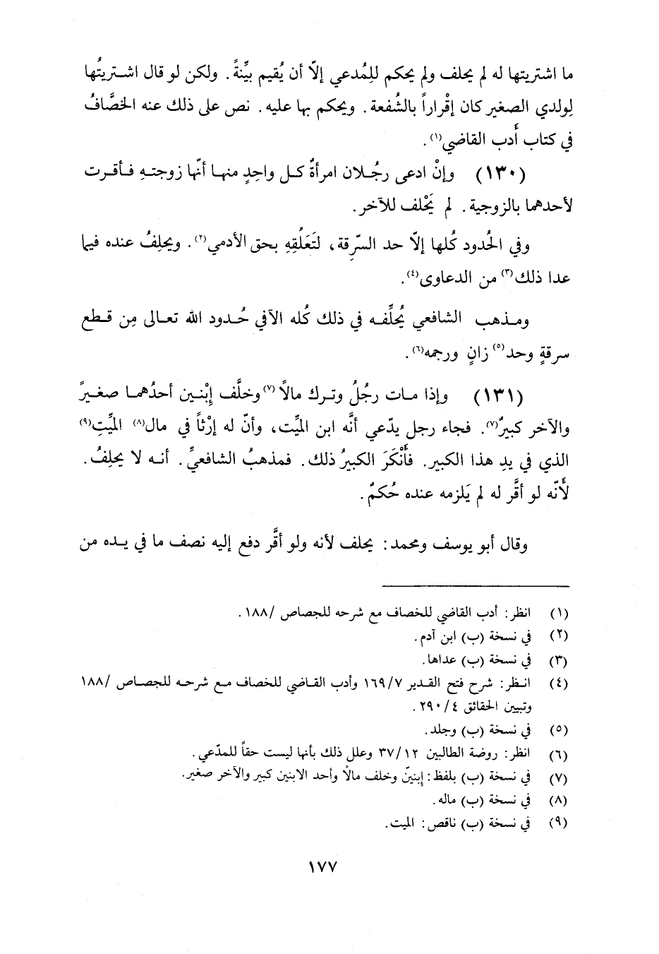 (131) وإذا مات رجل وترك مالًا وخلف ابنين أحدهما صغير والآخر كبير. فجاء رجل يدعي أنه ابن الميت, وأن له إرثًا في مال الميت الذي في يد هذا الكبير. فأنكر الكبير ذلك. فمذهب الشافعي: أنه لا يحلف لأنه لو أقر له لم يلزمه عنده حكم.