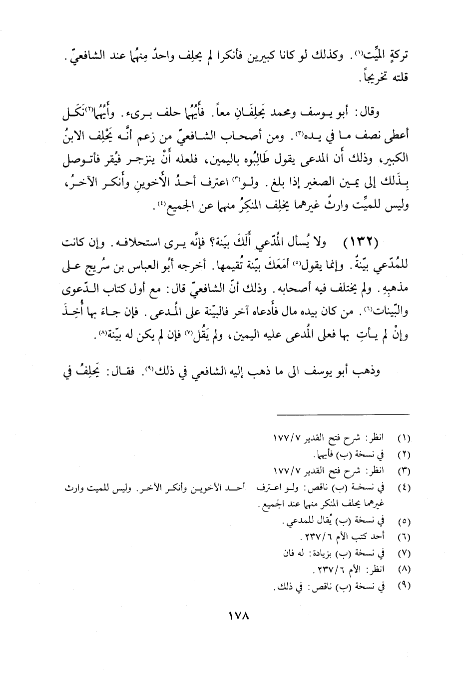 وقال: أبو يوسف ومحمد يحلفان معًا. فأيهما حلف بريء. وأيهما نكل أعطى نصف ما في يده. ومن أصحاب الشافعي من زعم أنه يحلف الابن الكبير, وذلك أن المدعى يقول طالبوه باليمين, فلعله أن ينزجر فيقر فأتوصل بذلك إلى يمين الصغير إذا بلغ. ولو اعترف أحدٌ الأخوين وأنكر الآخر, وليس للميت وارث غيرهما يخلف المنكر منهما عن الجميع.