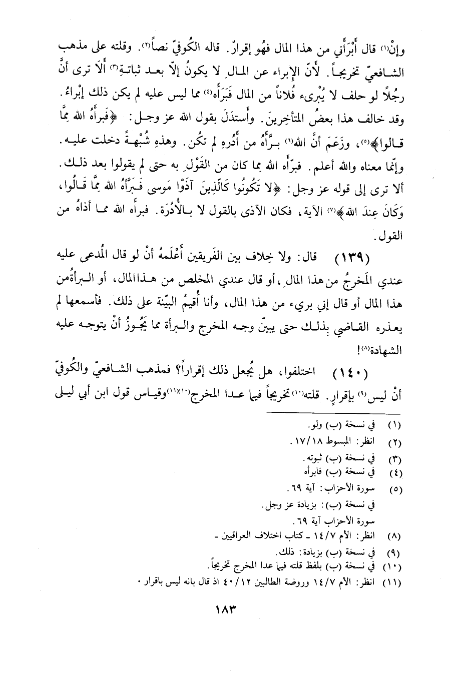 وإن قال أبرأني من هذا المال فهو إقرار. قاله الكوفي نصًا. وقلته على مذهب الشافعي تخريجًا. لأن الإبراء عن المال لا يكون إلا بعد ثباتة ألا ترى أن رجلًا لو حلف لا يبرئ فلانًا من المال فبرأه مما ليس عليه لم يكن ذلك إبراء. وقد خالف هذا بعض المتأخرين. وأستدل بقول الله عز وجل: {فَبَرَّأَهُ اللَّهُ مِمَّا قَالُوا} , وزعم أن الله برأه من أدره لم تكن. وهذه شبهة دخلت عليه. وإنما معناه والله أعلم. فبرأه الله مما كان من القول به حتى لم يقولوا بعد ذلك. ألا ترى إلى قوله عز وجل: {لا تَكُونُوا كَالَّذِينَ آذَوْا مُوسَى فَبَرَّأَهُ اللَّهُ مِمَّا قَالُوا وَكَانَ عِنْدَ اللَّهِ} الآية, فكان الأذى بالقول لا بالأدرة. فبرأه الله مما أذاه من القول.