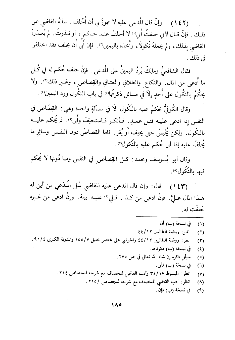 (142) وإن قال المدعى عليه لا يجوز لي أن أحلف. سأله القاضي عن ذلك. فإن قال لأني حلفت أني لا أحلف عند حاكم, أو نذرت. لم يعذره القاضي بذلك, ولم يجعله نكولًا, وأخذه باليمين. فإن أبى أن يحلف فقد اختلفوا في ذلك.