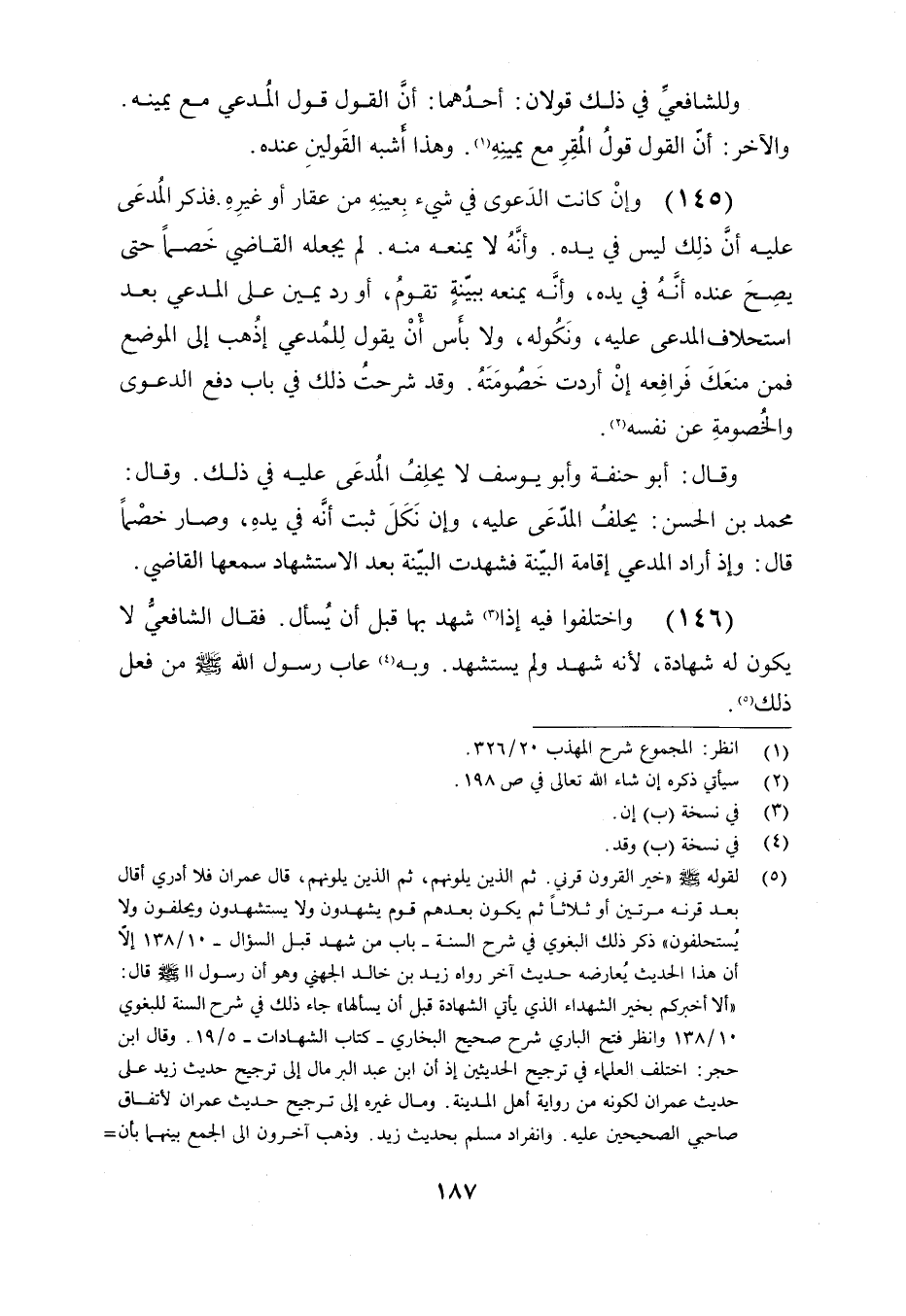(145) وإن كانت الدعوى في شيء بعينه من عقار أو غيره فذكر المدعى عليه أن ذلك ليلس في يده, وأنه يمنعه بينة تقوم, أو رد يمين على المدعي بعد استحلاف المدعى عليه, ونكوله, ولا بأس أن يقول للمدعي اذهب إلى الموضع فمن منعك فرافعه إن أردت خصومته. وقد شرحت ذلك في باب دفع الدعوى والخصومة عن نفسه.