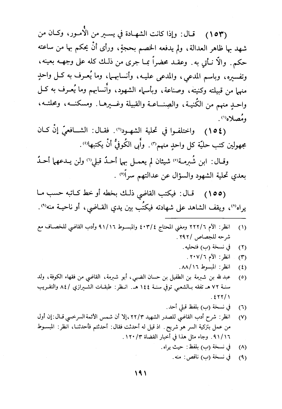 (153) قال: وإذا كانت الشهادة في يسير من الأمور, وكان من شهد بها ظاهر العدالة, ولم يدفعه الخصم بحجةٍ, ورأى أن يحكم بها من ساعته حكم. وإلا نأتي به. وعقد محضرًا بما جرى من ذلك كله على وجهه بعينه, وتفسيره, وباسم المدعي, والمدعى عليه, وأنسابهما, وما يعرف به كل واحدٍ منهما من قبيلته وكنيته, وصناعة, وبأسماء الشهود, وأنسابهم وما يعرف به كل واحدٍ منهم من الكنية, والصناعة والقبيلة وغيرها. ومسكنة, ومحلته, ومصلاه.