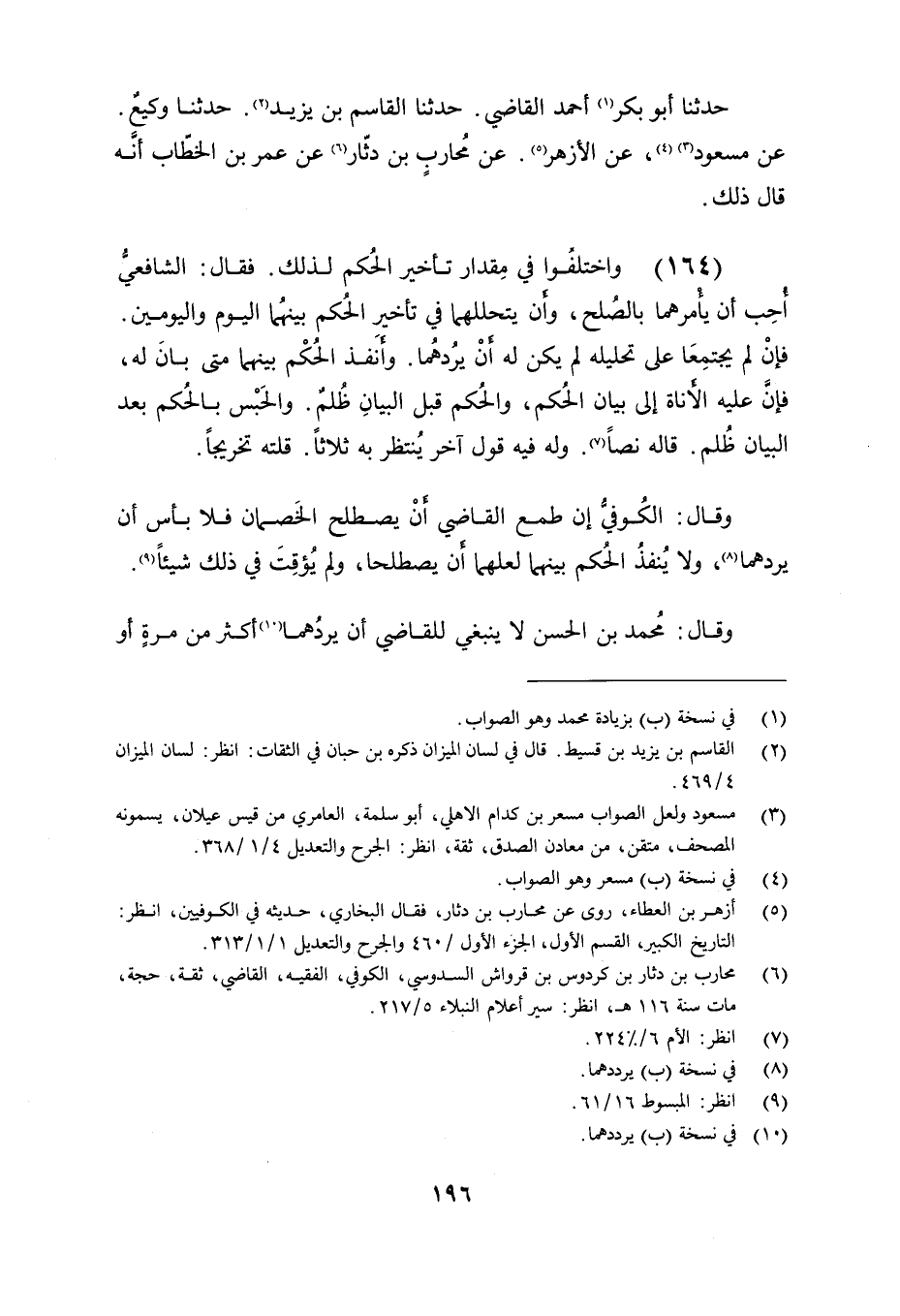 (164) واختلفوا في مقدار تأخير الحكم لذلك. فقال الشافعي: أجب أن يأمرهما بالصلح, وأن يتحللهما في تأخير الحكم بينهما اليوم واليومين. فإن لم يجتمعا على تحليله لم يكن له أن يردهما. وأنفذ الحكم بينهما اليوم واليومين. فإن لم يجتمعا على تحليله لم يكن له أن يردهما. وأنفذ الحكم بينهما متى بان له, فإن عليه الأناة إلى بيان الحكم, والحكم قبل البيان ظلم. والحبس بالحكم بعد البيان ظلم. قاله نصًا. وله فيه قول آخر ينتظر به ثلاثًا. ٌلته تخريجًا.