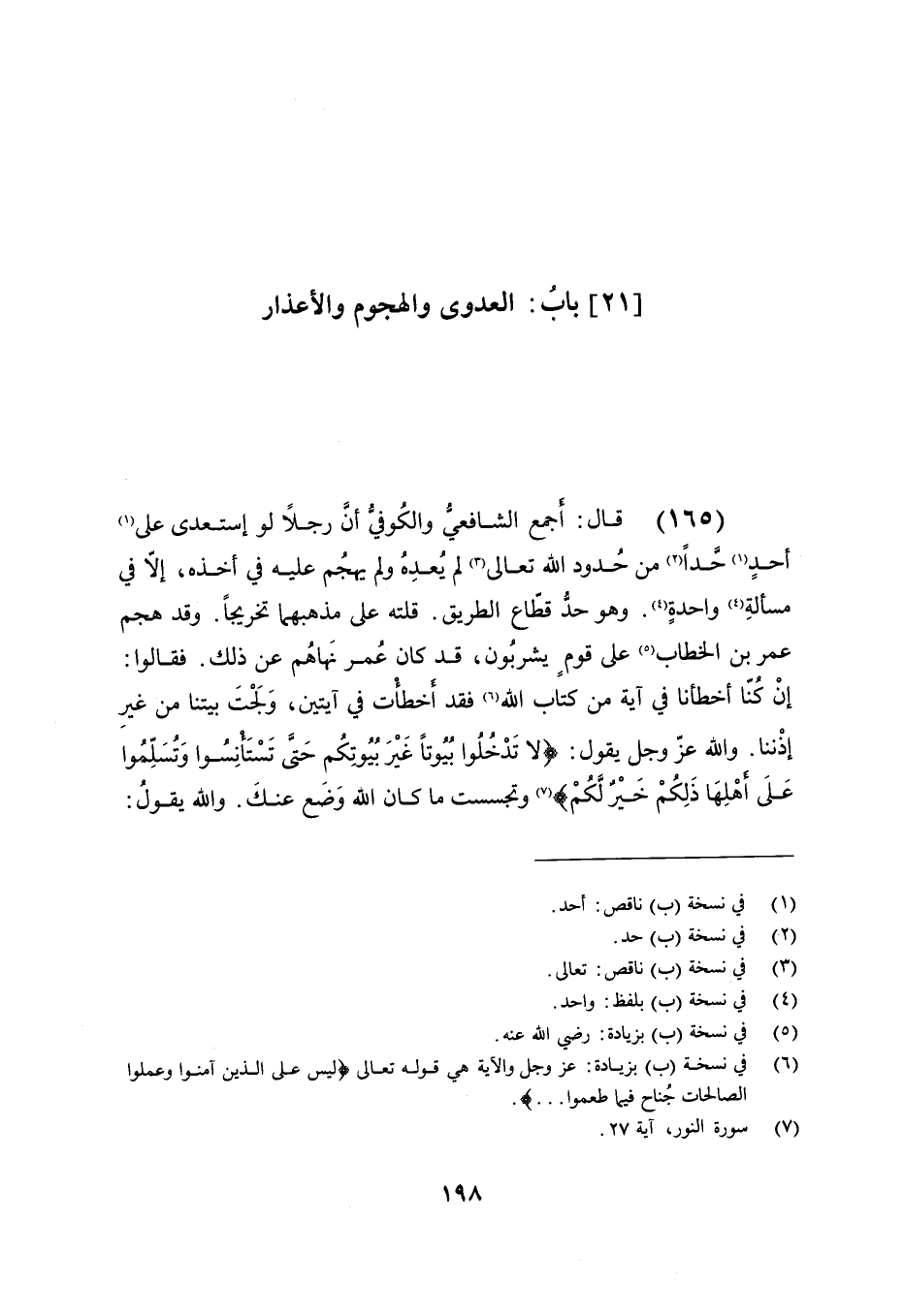 (165) قال: أجمع الشافعي والكوفي أن رجلًا لو استعدى على أحد حدًا من حدود الله تعالى لم يعده ولم يهجم عليه في أخذه, إلا في مسألة واحدة. وهو حدٌ قطاع الطريق. قلته على مذهبهما تخريجًا. وقد هجم عمر بن الخطاب على قومٍ يشربون, قد كان مر نهاهم عن ذلك. فقالوا: إن كنا أخطأنا في آية من كتاب الله فقد أخطأت في آيتين, ولجت بيتنا من غير إننا. والله عز وجل يقول: {لا تَدْخُلُوا بُيُوتًا غَيْرَ بُيُوتِكُمْ حَتَّى تَسْتَأْنِسُوا وَتُسَلِّمُوا عَلَى أَهْلِهَا ذَلِكُمْ خَيْرٌ لَكُمْ} وتحبست ما كان الله وضع عنك. والله يقول: