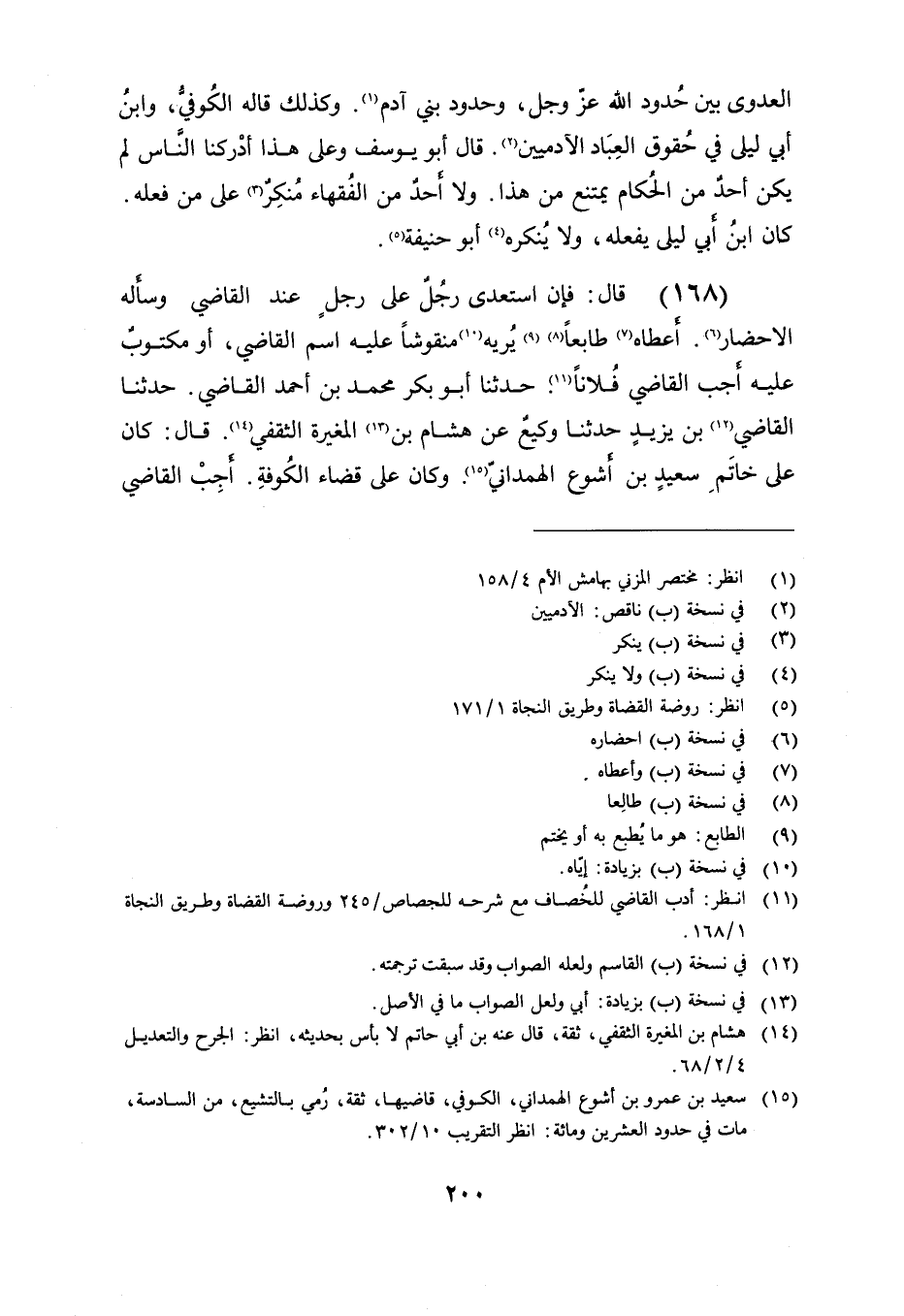 (168) قال: فإن استعدى رجل على رجل عند القاضي وسأله الاحضار. أعطاه طابعًا يريه منقوشًا عليه اسم القاضي, أو مكتوب عليه أجب القاضي فلانًا, حدثنا أبو بكر محمد بن أحمد القاضي. حدثنا القاضي بن يزيد حدثنا وكيع عن هشام بن المغيرة الثقفي. قال: كان على خاتم سعيد بن أشوع الهمداني. وكان على قضاء الكوفة أجب القاضي