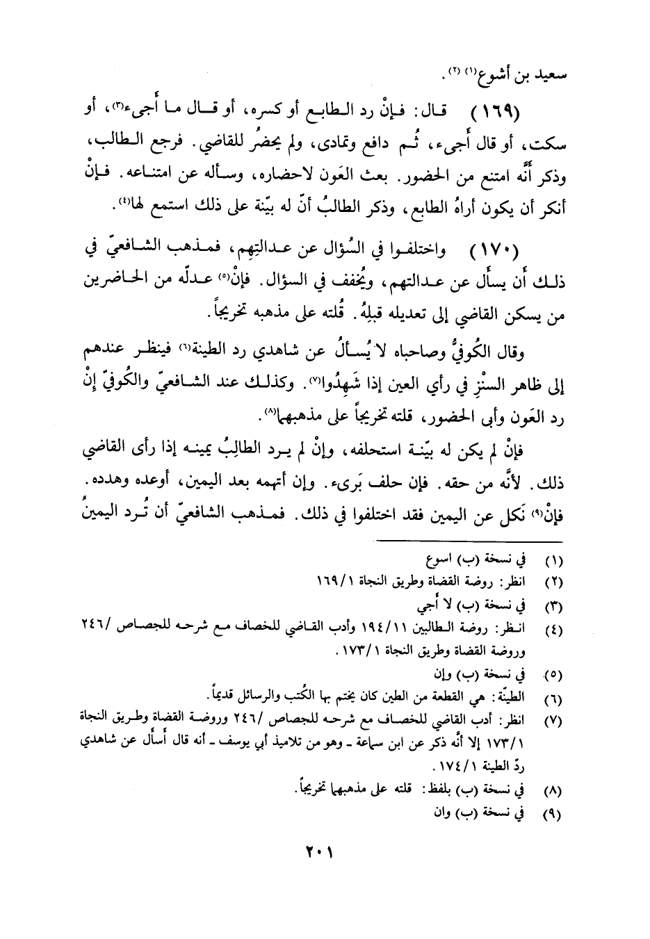 (170) واختلفوا في السؤال عن عدالتهم, فمذهب الشافعي في ذلك أن يسأل عن عدالتهم, ويخفف في السؤال. فإن عدله من الحاضرين من يسكن القاضي إلى تعديله قبله. قلته على مذهب تخريجًا.