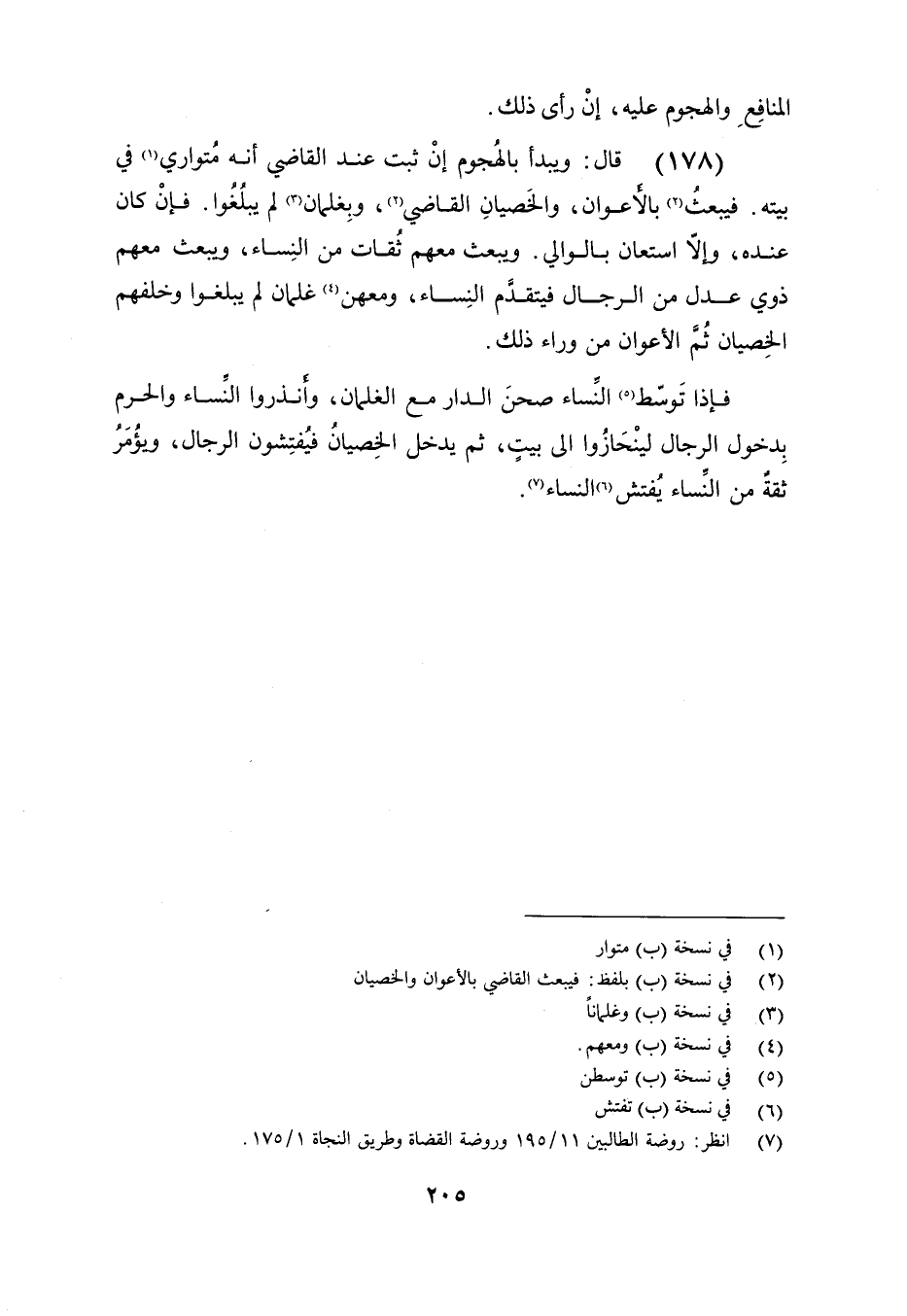 (178) قال: ويبدأ بالهجوم إن ثبت عند القاضي أنه متواري في بيته. فيبعث بالأعوان, والخصيان القاضي, وبغلمان لو يبلغوا. فإن كان عنده, وإلا استعان بالوالي. ويبعث معهم ثقات من النساء, ويبعث معهم ذوي عدل من الرجال فيتقدم النساء, ومعهن غلمان لم يبلغوا وخلفهم الخصاين ثم الأعوان من وراء ذلك.