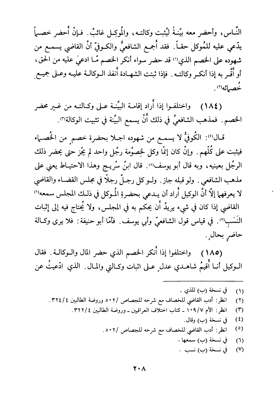 (184) واختلفوا إذا أراد إقامة البينة على وكالته من غير محضر الخصم. فمذهب الشافعي في ذلك أن يسمع البينة في تثبيت الوكالة.