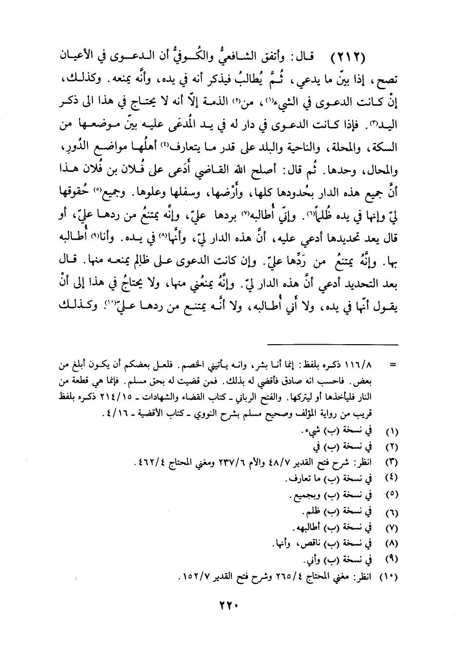 (212) قال: واتفق الشافعي والكوفي أن الدعوى في الأعيان تصح, إذا بين ما يدعي, ثم يطالب فيذكر أنه في يده, وأنه يمنعه. وكذلك, إن كانت الدعوى في الشيء, من الذمة إلا أنه لا يحتاج في هذا إلى ذكر اليد. فإذا كانت الدعوى في دار له في يد المدعي عليه بين موضعها من السكة, والمحلة, والناحية والبلد على قدر ما يتعارف أهلها مواضع الدور, والمجال وحدها. ثم قال: أصلح الله القاضي أدعى على فلان بن فلان هذا أن جميع هذه الدار بحدودها كلها, وأرضها, وسفلها وعلوها. وجميع حقوقها لي وإنها في يده ظلمًا. وإني أطالبه بردها علي, وإنه يمتنع من ردها علي, أو قال يعد تحديدها أدعي عليه, أن هذه الدار لي, وأنها في يده. وأنا أطالبه بها. وإنه يمتنع من ردها علي. وإن كانت الدعوى على ظالم يمنعه منها. قال بعد التحديد أدعي أن هذه الدار لي. وإنه يمنعني منها, ولا يحتاج في هذا إلى أن يقول أنها في يده, ولا أني أطالبه, ولا أنه يمتنع من ردها علي. وكذلك