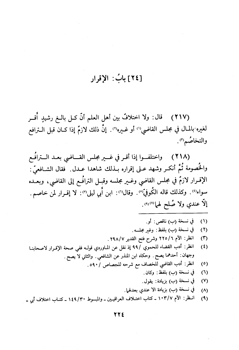 (217) قال: ولا اختلاف بين أهل العلم أن كل بالغ رشيد أقر لغيره بالمال في مجلس القاضي أو غيره. إن ذلك لازم إذا كان قبل الترافع والتخاصم.