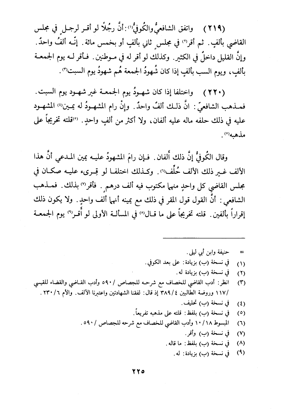 (219) واتفق الشافعي والكوفي: أن رجلًا لو أقر لرجل في مجلس القاضي بألف. ثم أقر في مجلس ثاني بألفٍ أو بخمس مائة. إنه ألف واحد. وإن القليل داخل في الكثير. وكذلك لو أقر له في موطنين. فأقر له يوم الجمعة بألف, يوم السبت بألف إذا كان شهود الجمعة هم شهود يوم السبت.