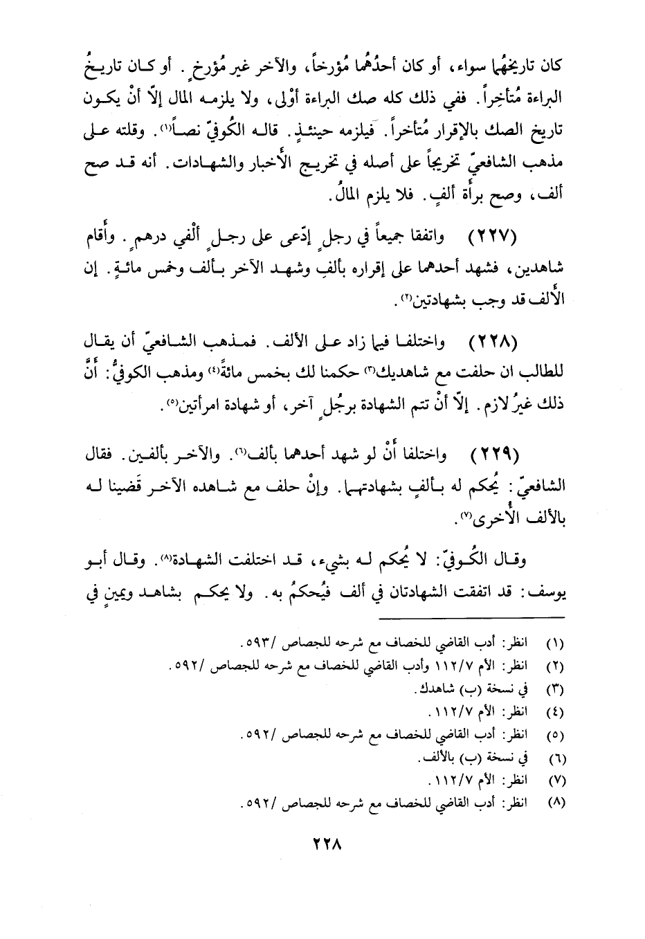 (227) واتفقا جميعًا في رجل ادعى على رجل ألفي درهم وأقام شاهدين, فشهد أحدهما على إقراره بألف وشهد الآخر بألف وخمس مائة. إن الألف قد وجب بشهادتين.