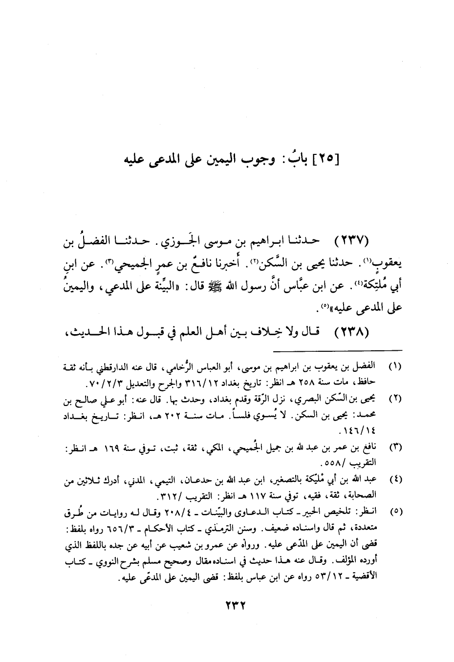 (237) حدثنا إبراهيم بن موسى الجوزي. حدثنا الفصل بن يعقوب. حدثنا بن السكن. أخبرنا نافع بن عمر الجميحي. عن ابن أبي ملتكة. عن ابن عباس أن رسول الله - صلى الله عليه وسلم - قال: «البينة على المدعي, واليمين على المدعى عليه».