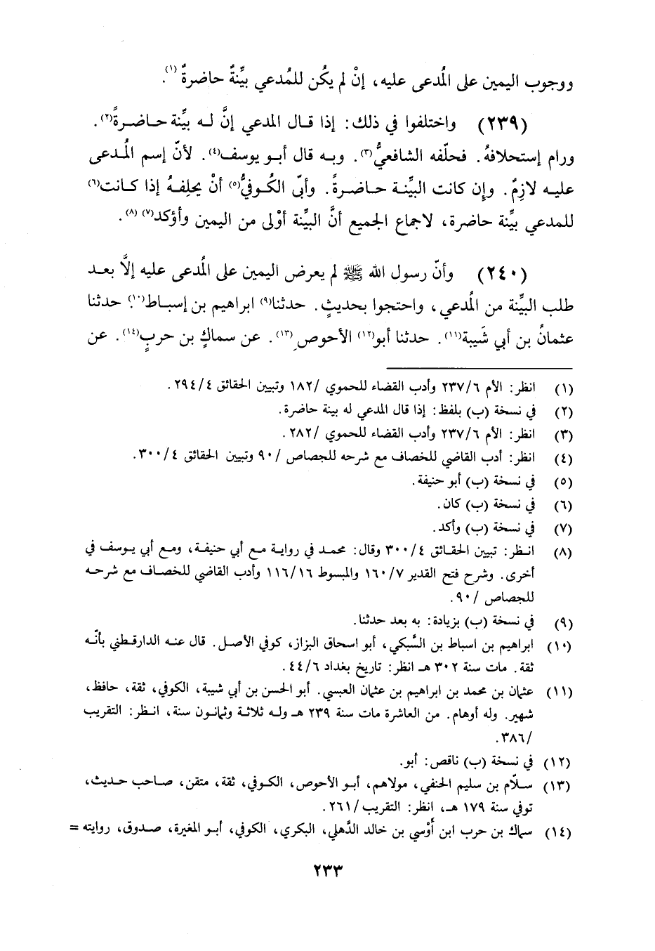 (240) وأن رسول الله - صلى الله عليه وسلم - لم يعرض اليمين على المدعى عليه إلا بعد طلب البينة من المدعي, واحتجوا بحديث. حدثنا إبراهيم بن إسباط, حدثنا عثمان بن أبي شيبة. حدثنا أبو الأحوص. عن سماك بن حرب. عن